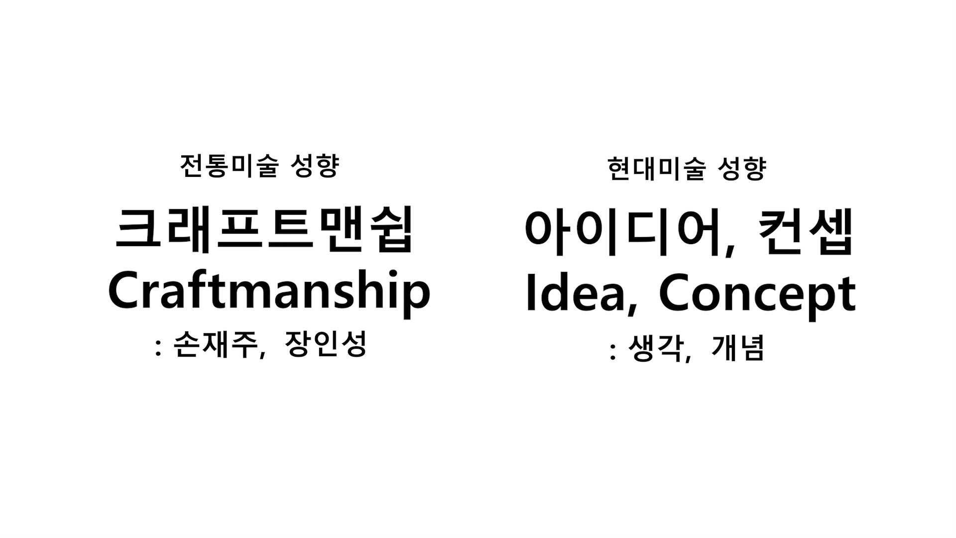 조금 더 깊게 잡담을 파보자면, 미술이 현대미술에 들어서면서 충돌하는 두 개의 키워드를 살펴볼 수 있는데요. 전통적인 미술을 대표하는 ‘손재주, 장인성’의 의미를 가진 단어 ‘크레프트맨쉽’과 현대미술을 대표하는 '생각', '개념'이라는 의미를 가진 '아이디어 혹은 컨셉'이라는 단어의 충돌이죠.